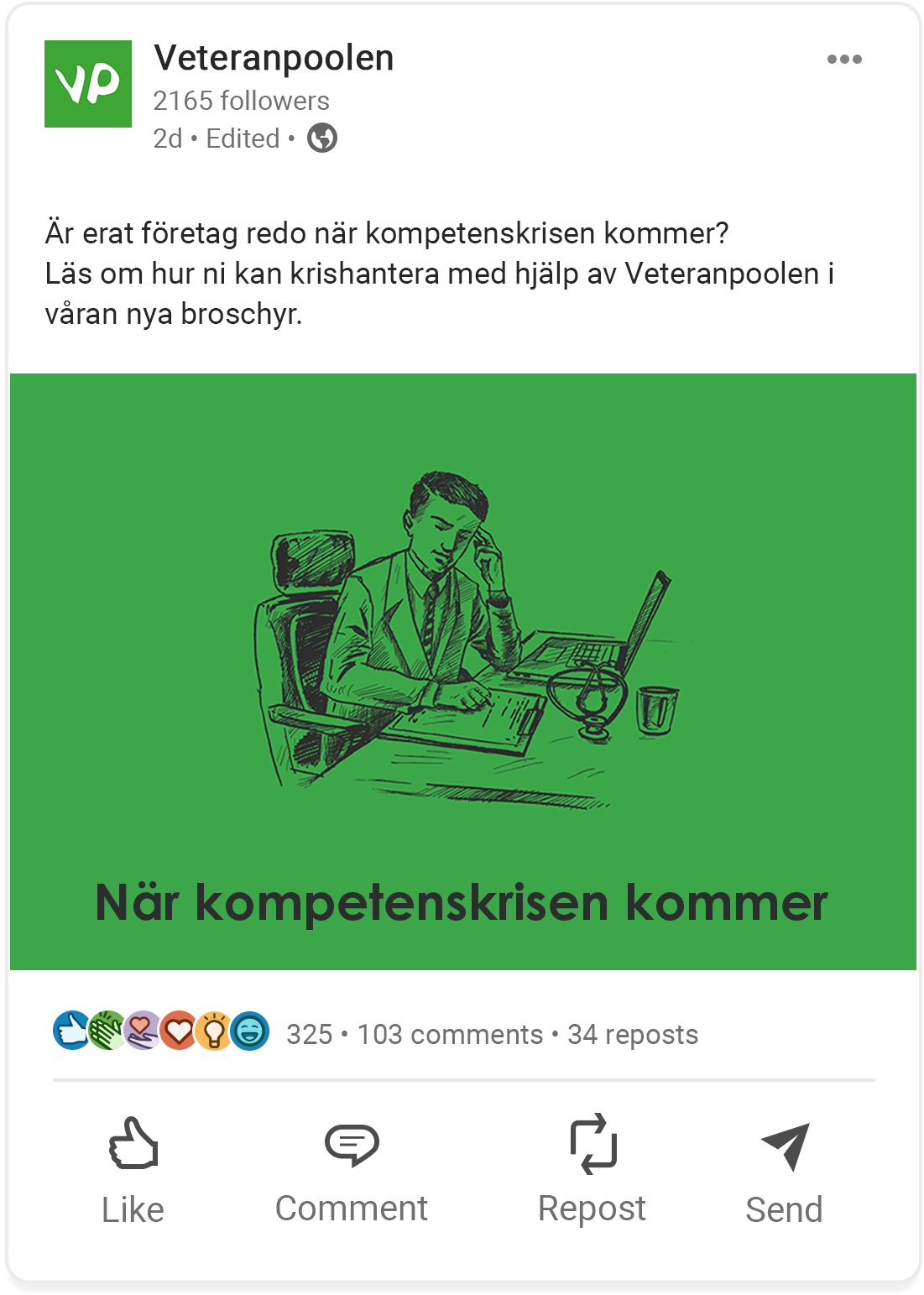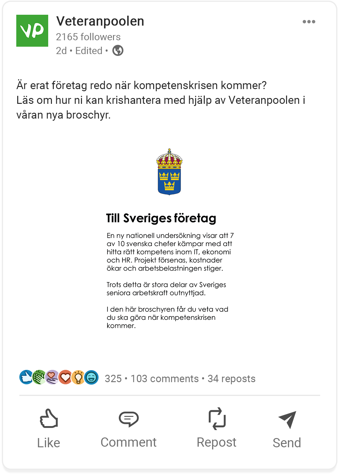 Ta fram en varumärkesbyggande kampanj som visar att Veteranpoolen kan bidra med viktig kompetens inom områden som IT, ekonomi och HR.